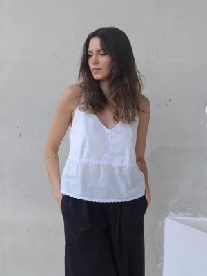 Blusa bata em cambraia de algodão, com decote em V frontal e decote reto nas costas com elástico. Alças finas com regulador e detalhes no…