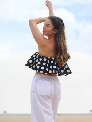 Top tomara que caia com babado no godê em tecido "linhão" azul marinho com estampa de poá grande off white. Elástico no forro superior e…