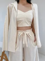 O cropped Regina é feito em tecido leve e confortável, com detalhes em pregas frontais que traz o caimento perfeito, formam o busto e acintura a peça. Alças médias e lastex nas costas para melhor ajuste, garantindo conforto e estilo. Super versátil e atemporal, combina perfeitamente com a camisa Elis areia e a calça Sebastiana areia e peça coringa para diversas combinações.