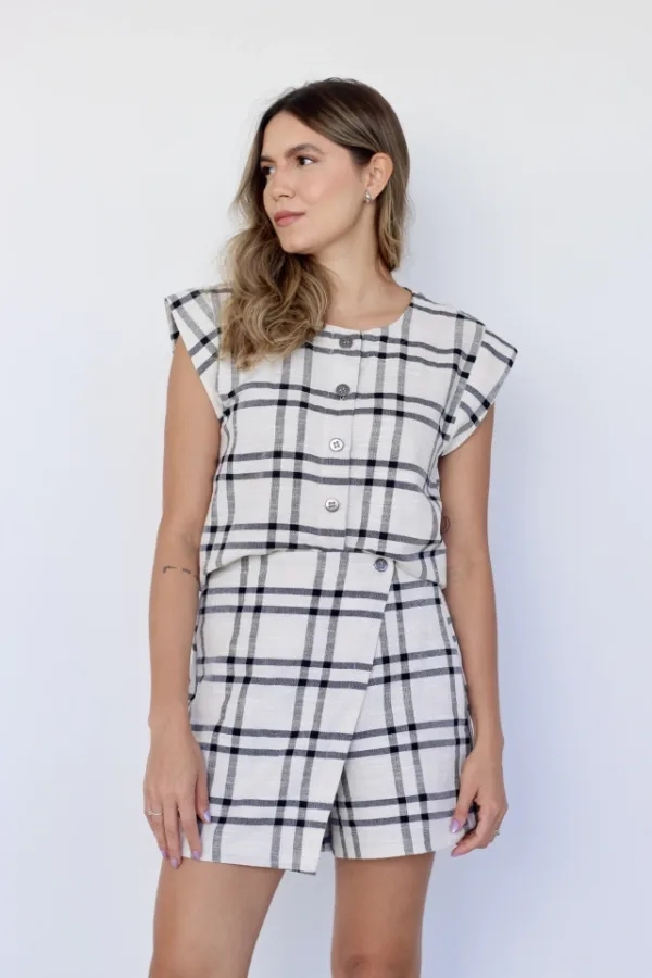 • Estampa Xadrez Clássica: Com fundo cru e padronagem preta, a estampa xadrez atemporal é uma escolha sofisticada que nunca sai de moda.